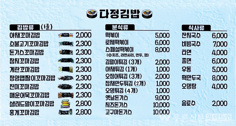 달서구 죽전네거리, 죽전역 2번 출구 바로 앞. 전자랜드 옆 건물 안쪽에는 조용히 존재감을 드러내는 신상 분식집이 있다. 최근 문을 연 ‘다정김밥’이 바로 그곳이다.