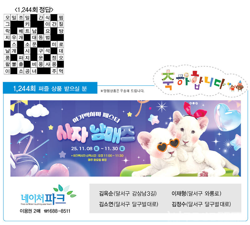 ♣ ‘가족과 함께 풀어보세요’정답을 아시는 분은 본사 편집부로 보내주시기 바랍니다. 12월 2일(화)까지 도착된 엽서 중에서 추첨을 통해 상품을 드립니다. 주소를 정확히 기재해 주십시오. 당첨상품을 우송해 드립니다.