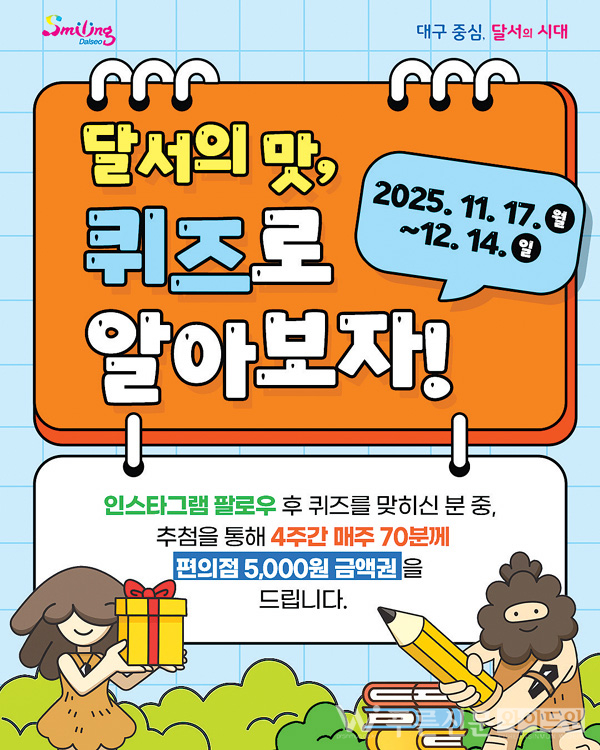 달서구가 오는 12월 14일(일)까지 4주간 온라인 퀴즈 이벤트 ‘달서의 맛, 퀴즈로 알아보자!’를 진행한다.