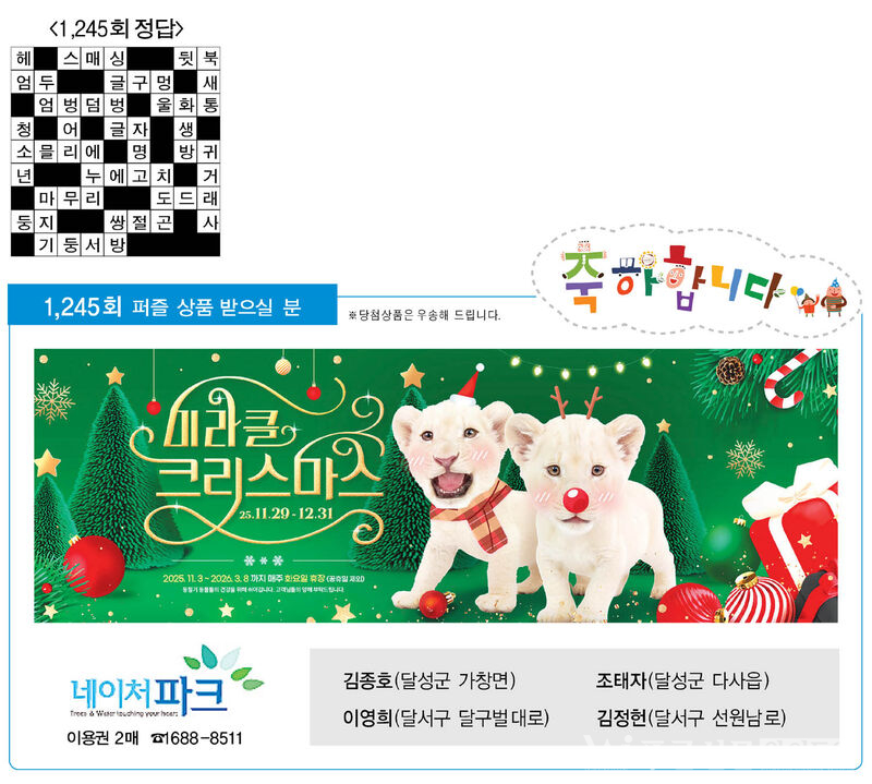 ♣ ‘가족과 함께 풀어보세요’정답을 아시는 분은 본사 편집부로 보내주시기 바랍니다. 12월 9일(화)까지 도착된 엽서 중에서 추첨을 통해 상품을 드립니다. 주소를 정확히 기재해 주십시오. 당첨상품을 우송해 드립니다.