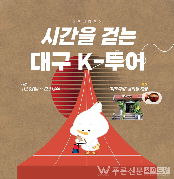 대구시는 K-컬처와 레트로 감성을 체험할 수 있는 특별노선 ‘시간을 걷는 대구 K-투어’를 오는 12월 31일(수)까지 매일(월요일 제외) 운영한다.