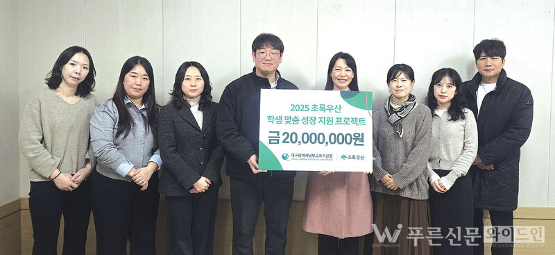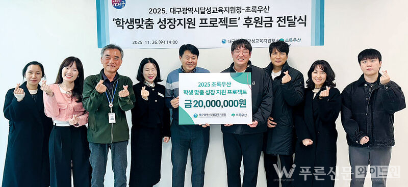 초록우산어린이재단이 대구남부교육지원청과 달성교육지원청에 각각 2,000만 원씩 총 4,000만 원의 ‘학생맞춤 성장지원금’을 전달했다. 지원금은 두 지역 위기학생 20명에게 1인당 200만 원씩 의료·주거·교육 등 맞춤형 지원에 활용될 예정이다.