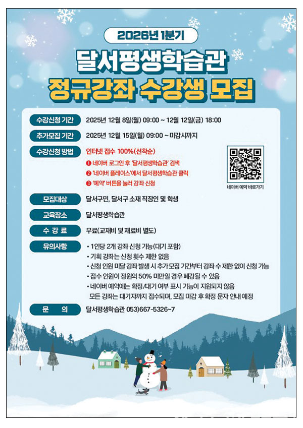 달서구는 2026년 1분기 달서평생학습관 정규강좌 수강생을 선착순 모집하고 있다.