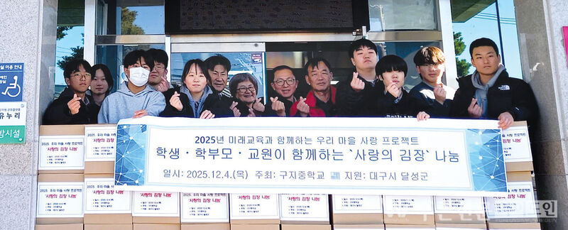 구지중학교(교장 강현구)는 지난 4일(목) 학생, 학부모, 교직원이 함께 담근 김장김치 50박스(6㎏)를 구지면 행정복지센터에 기부했다. 기탁된 김치는 관내 저소득 가구에 전달될 예정이다.