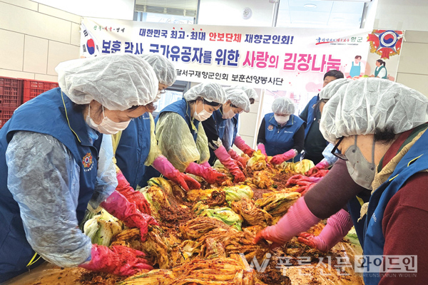 달서구 보훈선양봉사단은 지난 10일(수) 송현희망센터에서 보훈가족을 위한 ‘사랑의 김장 나눔’ 봉사활동을 진행했다. 단원 20여 명은 총 130포기의 김치를 생활이 어려운 보훈단체 회원들에게 전달했다.