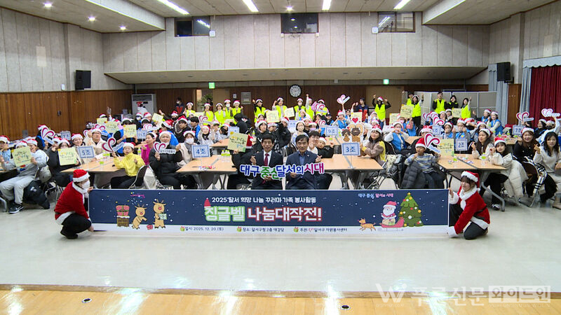 달서구는 지난 20일 달서구청 대강당에서 가족과 학생, 전문 봉사자들이 함께하는 연말 나눔 행사 ‘2025 징글벨 나눔 대작전’을 열고, 사랑과 희망이 담긴 선물 꾸러미를 만들어 지역 취약계층에 전달했다.