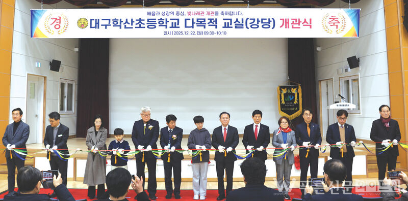 대구학산초 ‘빛나래관’ 개관 [사진제공=대구학산초등학교]대구학산초등학교(교장 이윤창)는 지난해 12월 22일(월) 교내 다목적 교실(강당)인 ‘빛나래관’ 개관식을 개최했다. 이날 행사에는 5·6학년 학생을 비롯해 학부모와 외부 내빈이 참석해 개관을 축하했다.