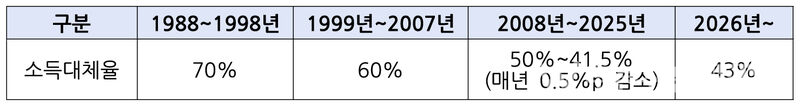 국민연금은 연금액 산정 시 ‘소득대체율’이 반영됩니다.