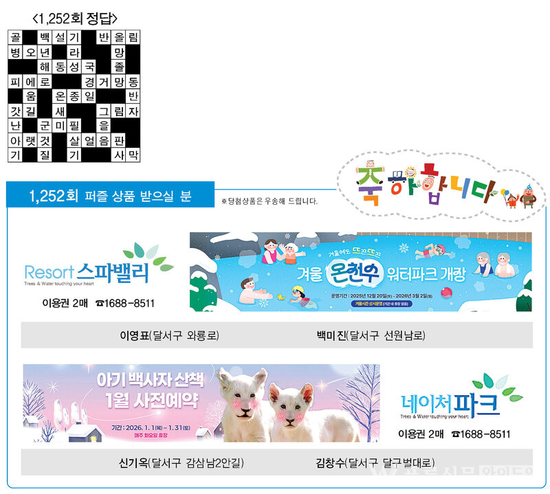 ♣ ‘가족과 함께 풀어보세요’정답을 아시는 분은 본사 편집부로 보내주시기 바랍니다. 1월 27일(화)까지 도착된 엽서 중에서 추첨을 통해 상품을 드립니다. ※주소를 정확히 기재해 주십시오. 당첨상품을 우송해 드립니다.