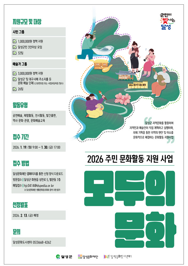 (재)달성문화재단 달성문화도시센터는 지역 주민과 예술가들의 문화활동을 지원하는 ‘모두의 문화’ 사업에 참여할 단체를 1월 30일(금)까지 모집한다.