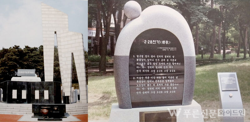 두류공원 내 2.28민주운동기념탐(좌), 2.28기념중앙공원에 건립된 2.28찬가 노래비(우)