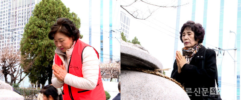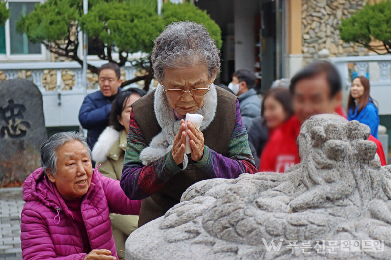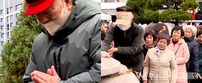감삼동 주민이 소금복단지에 소망이 담긴 소금을 채우며 간절히 기도하고 있다. [사진=이원선기자]