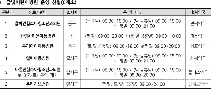 대구시 달빛어린이병원 현황은 대구시 누리집 및 응급의료포털(E-Gen)에서 확인할 수 있다.