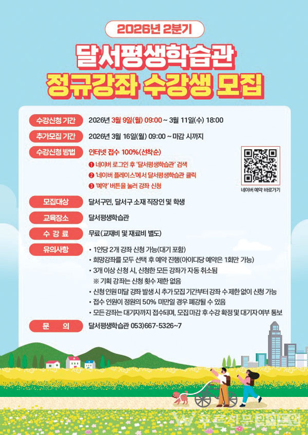 달서구가 지난 9일(금)부터 ‘2026년 2분기 달서평생학습관 정규강좌’ 수강생을 선착순 모집하고 있다.