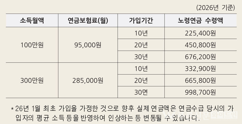 예를 들어, 월 소득액이 100만원(보험료 9.5만원)인 분과 300만원(보험료 28.5만원)인 분이 받게 되는 연금액은 가입기간에 따라서 아래와 같은 차이가 납니다.