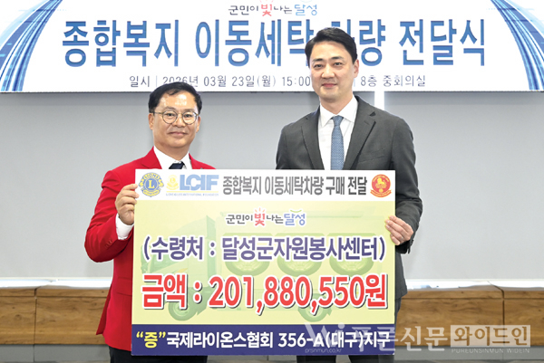 국제라이온스협회 대구(356-A)지구와 LCIF가 달성군자원봉사센터에 2.5톤 이동세탁차를 기증했다.