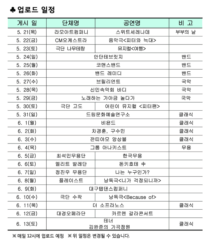 언제, 어디서든 내가 즐기고 싶을 때 다양한 장르의 공연을 즐길 수 있는 ‘24시간 On-air’ ‘예술人 희망in 달서, 슬기로운 문화생활’은 6월 13일 ‘테너 김완준의 가곡정원’ 까지 3주 동안 매일 정오 웃는얼굴아트센터 유튜브 채널과 웃는얼굴아트센터 홈페이지에 업로드 되며 누구나 무료로 즐길 수 있다. 문의) 053-584-8719