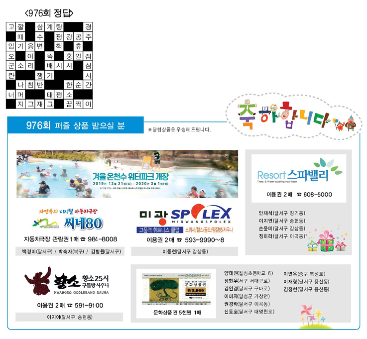 ♣ ‘가족과 함께 풀어보세요’정답을 아시는 분은 본사 편집부로 보내주시기 바랍니다. 6월 23일까지 도착된 엽서 중에서 추첨을 통해 상품을 드립니다. 주소를 정확히 기재해 주십시오. 당첨상품을 우송해 드립니다.