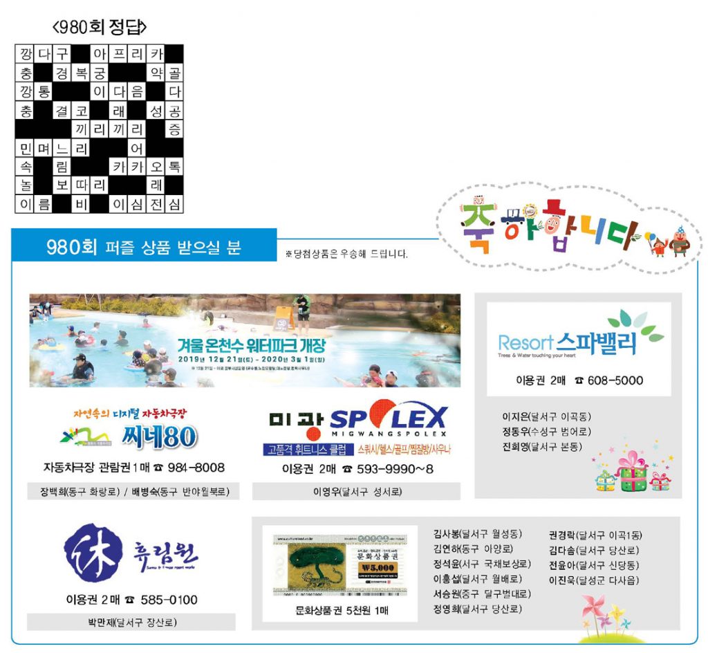 ◑ ‘가족과 함께 풀어보세요’ 낱말퍼즐을 만들어 푸른신문으로 보내주세요. 채택된 분께는 작은 선물을 우송해 드립니다.