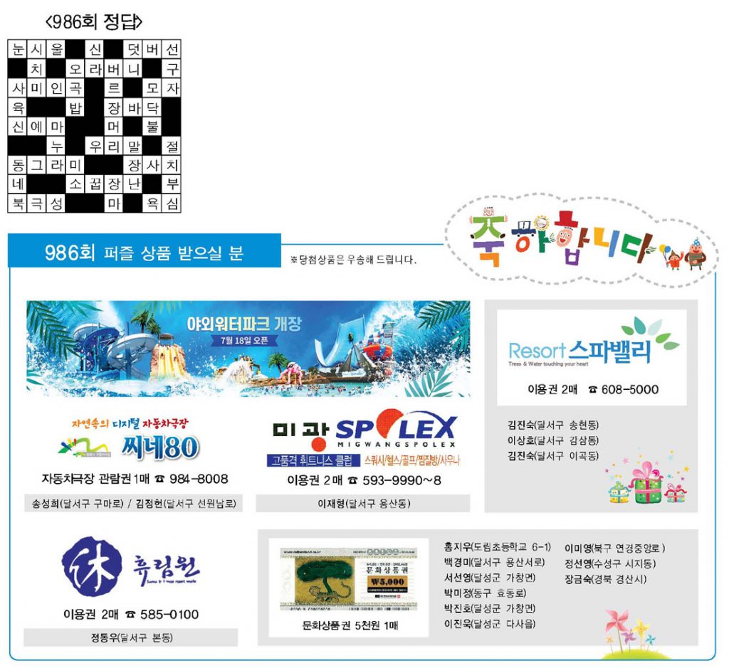 ♣ ‘가족과 함께 풀어보세요’정답을 아시는 분은 본사 편집부로 보내주시기 바랍니다. 9월 8일까지 도착된 엽서 중에서 추첨을 통해 상품을 드립니다. 주소를 정확히 기재해 주십시오. 당첨상품을 우송해 드립니다.