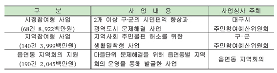 2021년 주민참여예산사업 최종 선정 총규모는 총 약 150억 원이며, 각 분야별로 살펴보면 ‘두류공원 와이파이 설치 사업’ 등 시정참여형 68건 89억 원, 북구 ‘저출산 인구 문제 해결을 위한 톡톡 아이디어 지원 사업’ 등 지역참여형 140건 40억 원, 서구 비산2·3동 ‘청소년이 만드는 축제 와! 와!’ 사업 등 읍면동 지역회의 지원 사업 190건 20억 원이다.