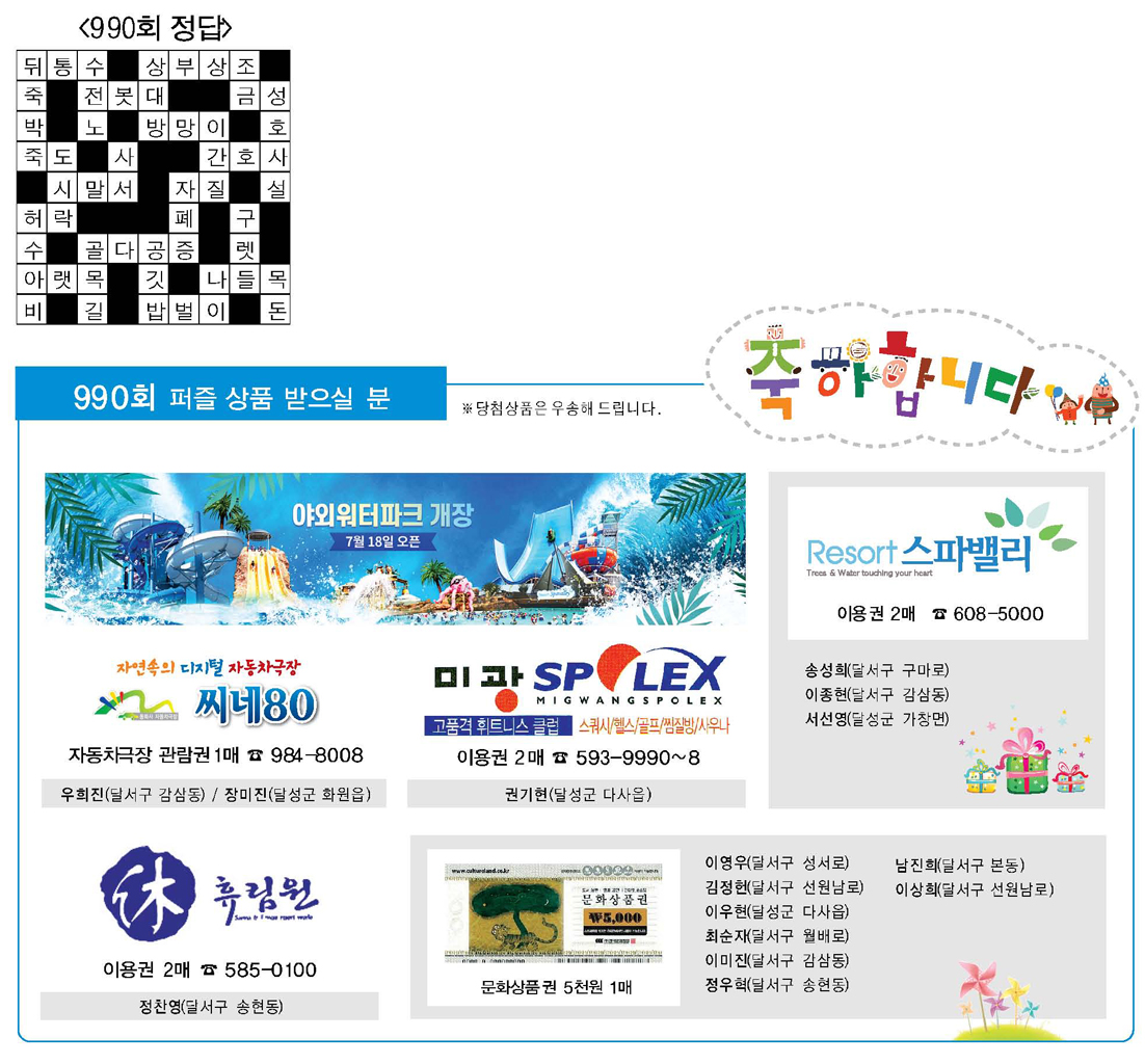 ♣ ‘가족과 함께 풀어보세요’정답을 아시는 분은 본사 편집부로 보내주시기 바랍니다. 10월 13일까지 도착된 엽서 중에서 추첨을 통해 상품을 드립니다. 주소를 정확히 기재해 주십시오. 당첨상품을 우송해 드립니다.