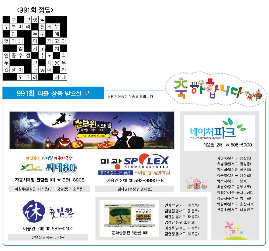♣ ‘가족과 함께 풀어보세요’정답을 아시는 분은 본사 편집부로 보내주시기 바랍니다. 10월 20일까지 도착된 엽서 중에서 추첨을 통해 상품을 드립니다. 주소를 정확히 기재해 주십시오. 당첨상품을 우송해 드립니다.