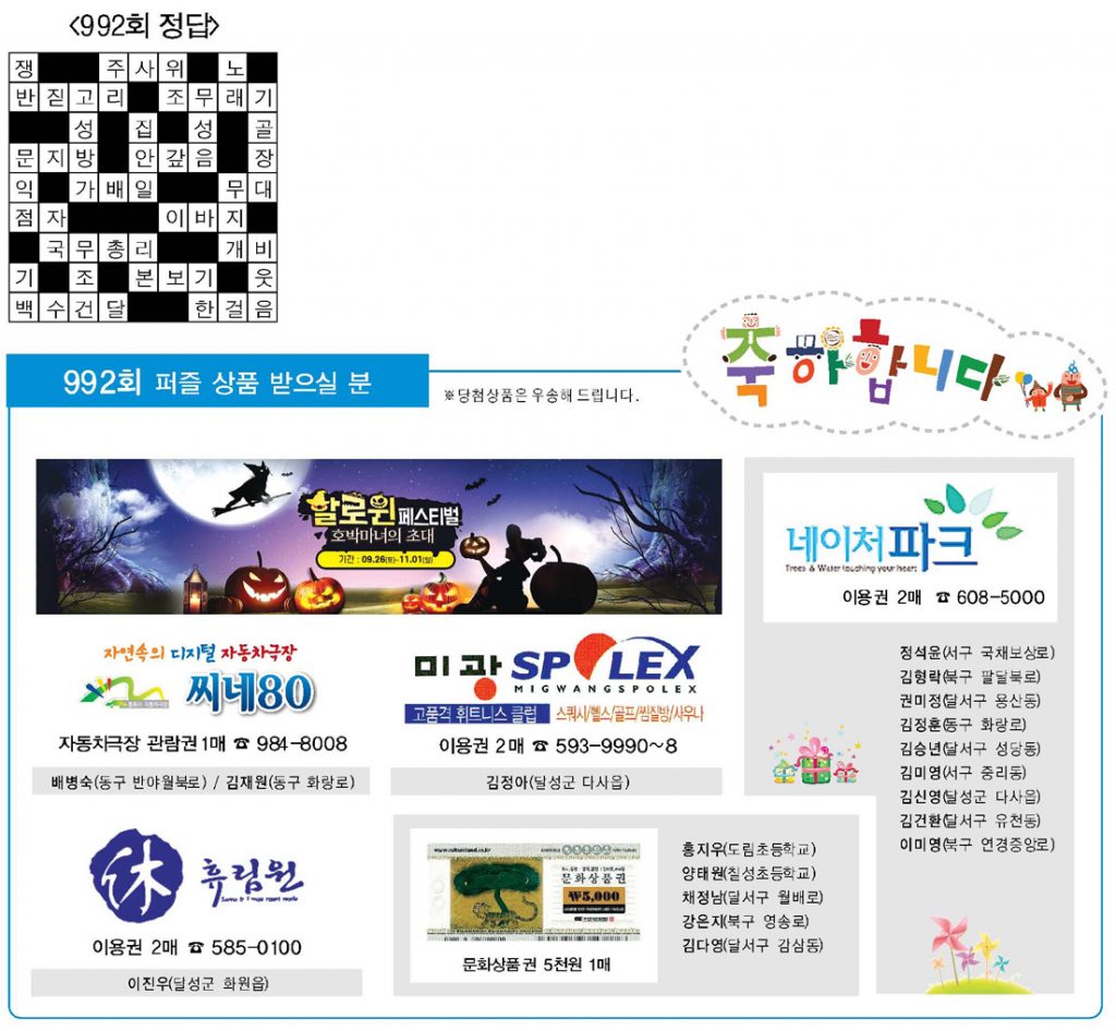 ♣ ‘가족과 함께 풀어보세요’정답을 아시는 분은 본사 편집부로 보내주시기 바랍니다. 10월 27일까지 도착된 엽서 중에서 추첨을 통해 상품을 드립니다. 주소를 정확히 기재해 주십시오. 당첨상품을 우송해 드립니다.