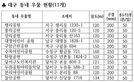 대구시의 2016년 지하수관리계획(2017~2026)을 짠 지하수 전문기관은 “동네 우물 13개소를 지속적으로 조사한 결과 먹는 물 수질 기준에 적합하고 미네랄이 풍부해 좋은 물”이라고 결론 냈다. 13개 동네 우물을 대상으로 4년간 36회 수질을 조사했는데 아무런 문제가 없었다고 했다. 전문기관은 “질 좋은 내추럴미네랄워터를 대구 시민에게 제공하는 동네 우물을 확대해야 한다”며 “8개 구군별로 고르게 30개소를 더 개발하라”고 권했다.