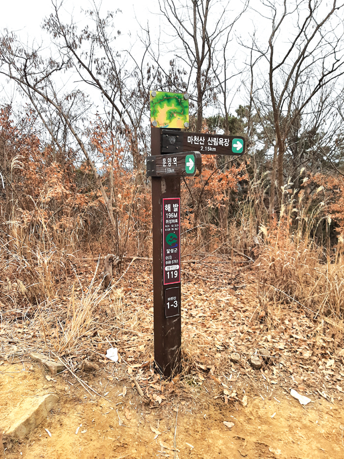 마천산은 해발 196m의 동네 뒷산 같은 느낌의 나지막한 산으로 편안한 마음으로 산책과 트레킹 하기 좋은 산이다. 문양역 바로 옆에 있기 때문에 주차 걱정 없이 대중교통을 이용한 접근성도 아주 좋다.