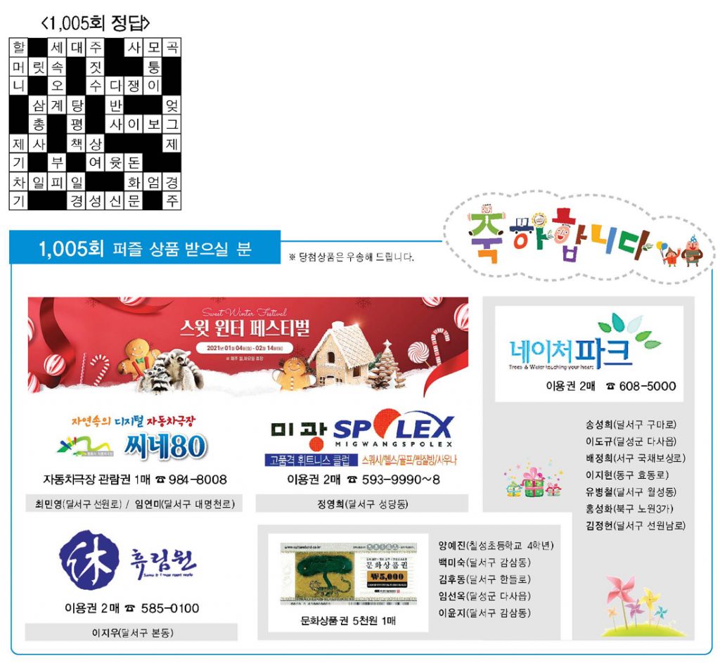 ♣ ‘가족과 함께 풀어보세요’정답을 아시는 분은 본사 편집부로 보내주시기 바랍니다. 1월 26일까지 도착된 엽서 중에서 추첨을 통해 상품을 드립니다. 주소를 정확히 기재해 주십시오. 당첨상품을 우송해 드립니다.