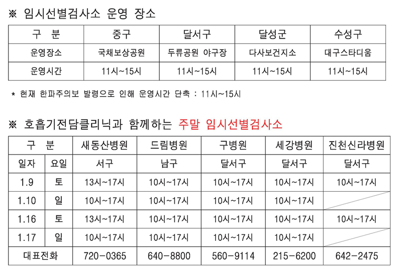 시에서는 지난 12월 22일부터 익명 검사가 가능한 임시선별검사소를 국채보상공원과 두류공원 야구장, 다사보건지소 3곳을 운영해 왔으며, 더불어 이번 달 7일부터는 대구스타디움 드라이브스루 임시선별소를 추가로 운영 중에 있다.