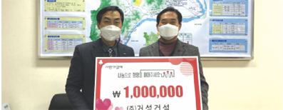 새해에도 지역주민을 위한 성금모금에 많은 분들이 동참하여 온정의 손길을 보내고 있다. (주)거성건설(대표 이대원)에서 2021년 지난 8일 다산면에 불우이웃돕기 사랑의 성금 100만 원을 기탁했다.