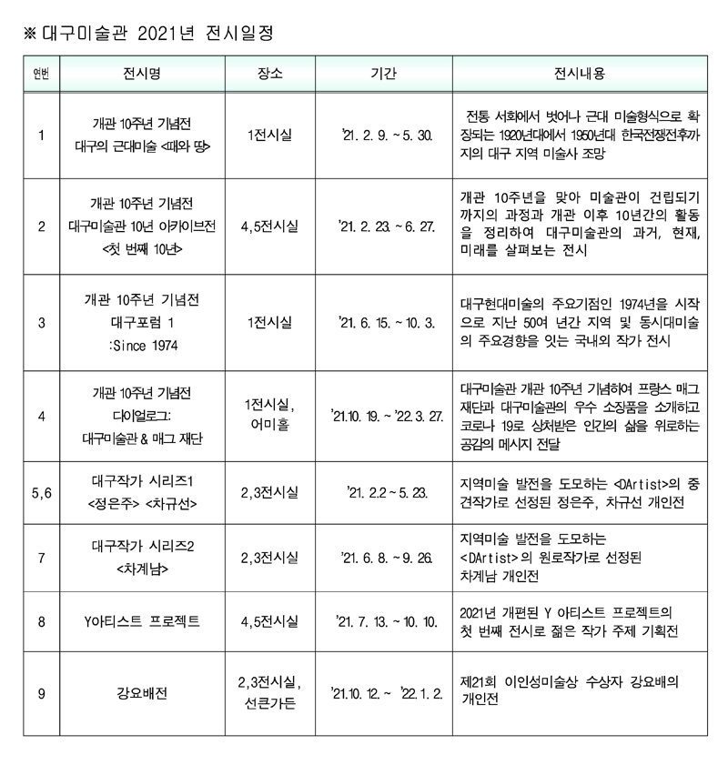 대구미술관(최은주 관장)은 개관 10주년을 맞아 2021년 슬로건을 ‘공감의 미술관, 하이 터치 뮤지엄(High Touch Museum)’으로 잡고, 온·오프라인 전시, 교육 및 디지털 미술관 운영을 강화하여 다양한 소통과 심화된 기획이 가능한 미술관으로 성장하고자 한다.