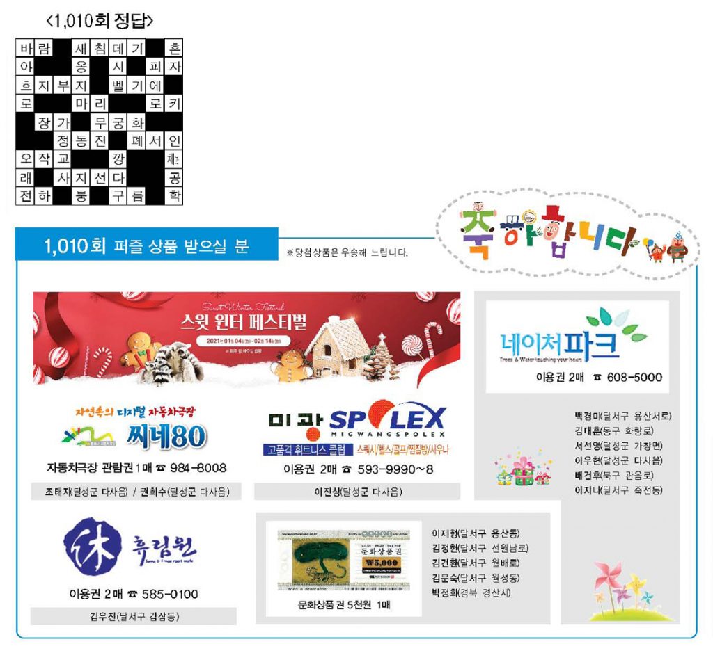 ♣ ‘가족과 함께 풀어보세요’정답을 아시는 분은 본사 편집부로 보내주시기 바랍니다. 3월 2일까지 도착된 엽서 중에서 추첨을 통해 상품을 드립니다. 주소를 정확히 기재해 주십시오. 당첨상품을 우송해 드립니다.