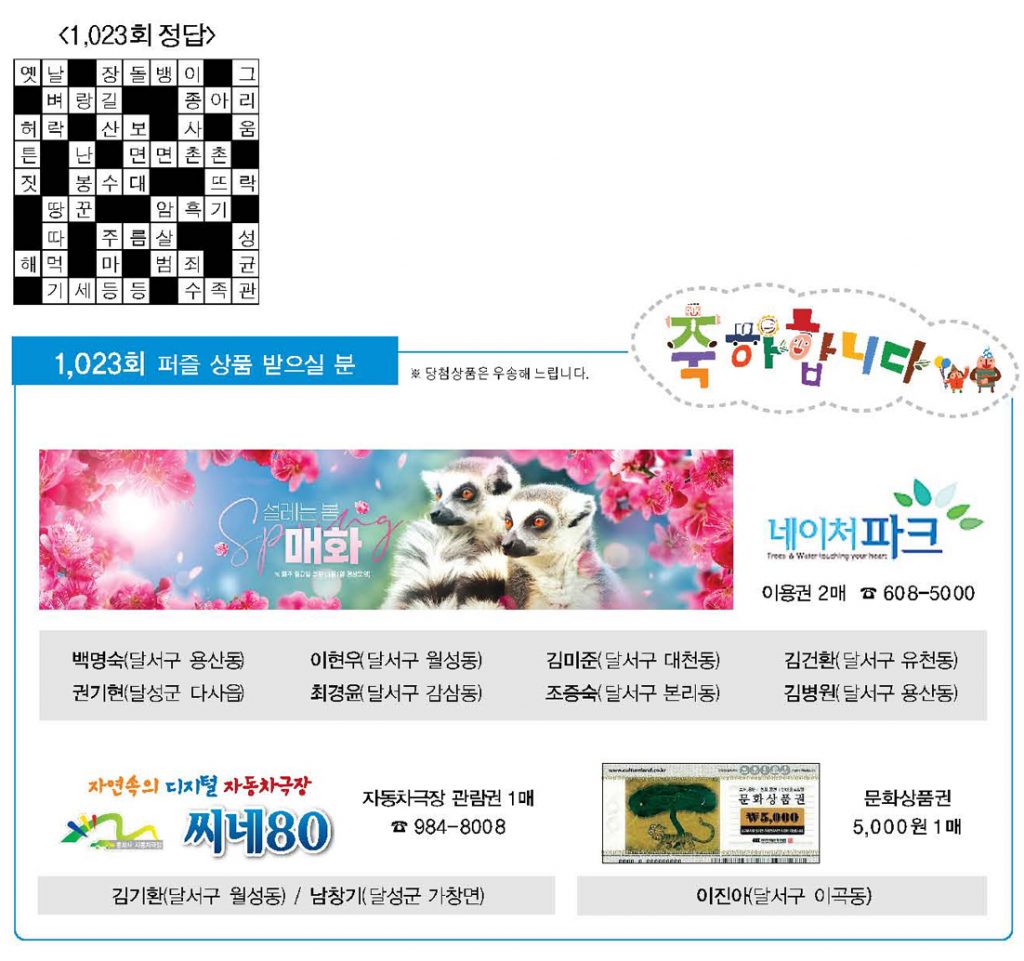 ♣ ‘가족과 함께 풀어보세요’정답을 아시는 분은 본사 편집부로 보내주시기 바랍니다. 6월 1일까지 도착된 엽서 중에서 추첨을 통해 상품을 드립니다. 주소를 정확히 기재해 주십시오. 당첨상품을 우송해 드립니다.