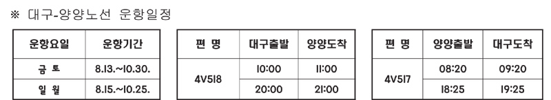 대구시는 코로나19로 지친 지역민들의 여행욕구 충족과 공항 활성화를 위해 8월 13일(금)부터 대구국제공항의 대구-양양노선 운항(주8편)을 재개한다.