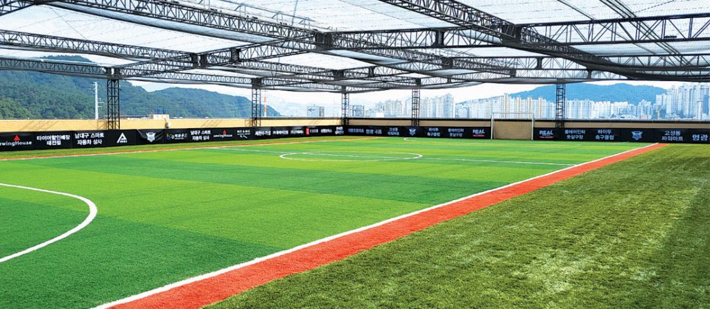 풋살장이 제가보기엔 작아서 10인 이상은 공을 찰 수 없냐고 물어보니, 대박! 옥상에도 풋살장이 있었습니다. 7층에도 올라가 보니 탁 트인 전망에 넓은 풋살장이 있었는데, 어느 구장보다 깨끗하고 넓은 공간에 “우아” 소리가 절로 나옵니다.
