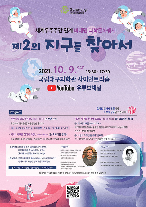 국립대구과학관(관장 백운기)은 세계 우주 주간을 맞이해 10월 9일 비대면 과학문화행사 ‘제2의 지구를 찾아서’를 개최한다. 이번 행사는 가정에서도 현장감 있게 즐길 수 있도록 온라인 비대면으로 다양한 프로그램을 선보일 예정이다.