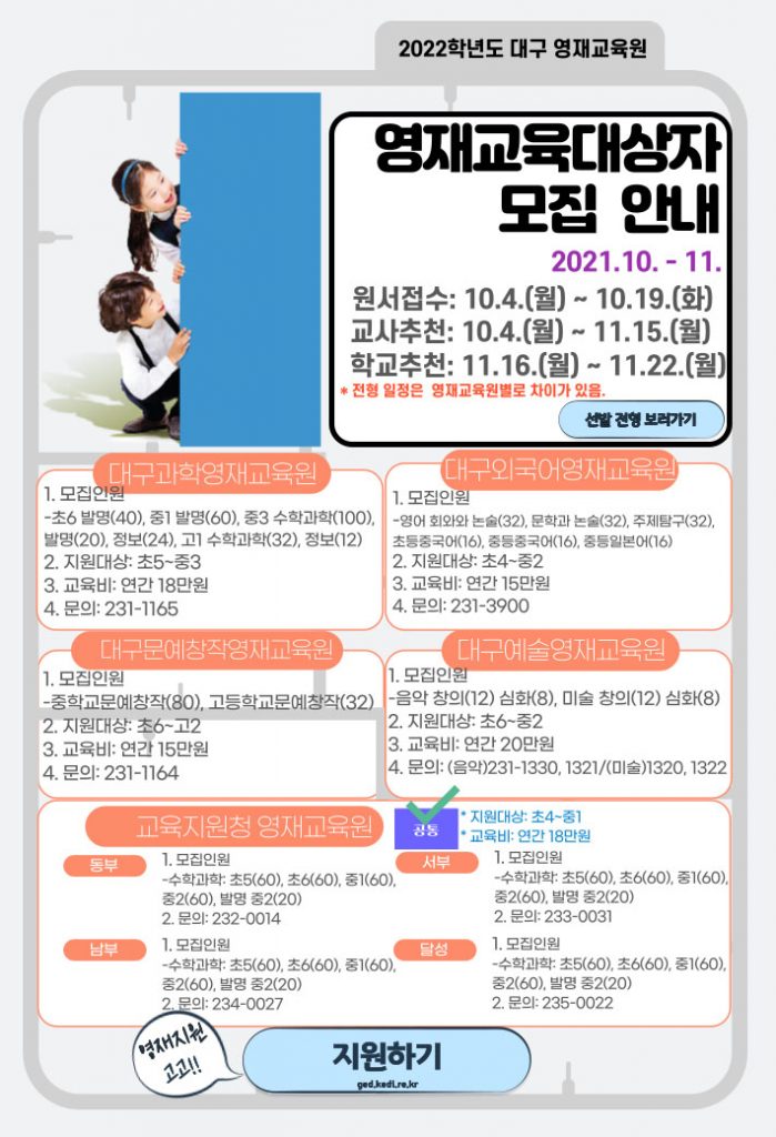 한편 대구시교육청에서는 영재교육 기회 제공 확대를 위해 각급 학교에서 운영되는 2022학년도 영재학급 교육대상자 모집은 2022년 3월에, KAIST영재교육센터에서 운영하는 대구사이버영재교육원은 2022년 4월에 별도 전형을 가질 예정이다.