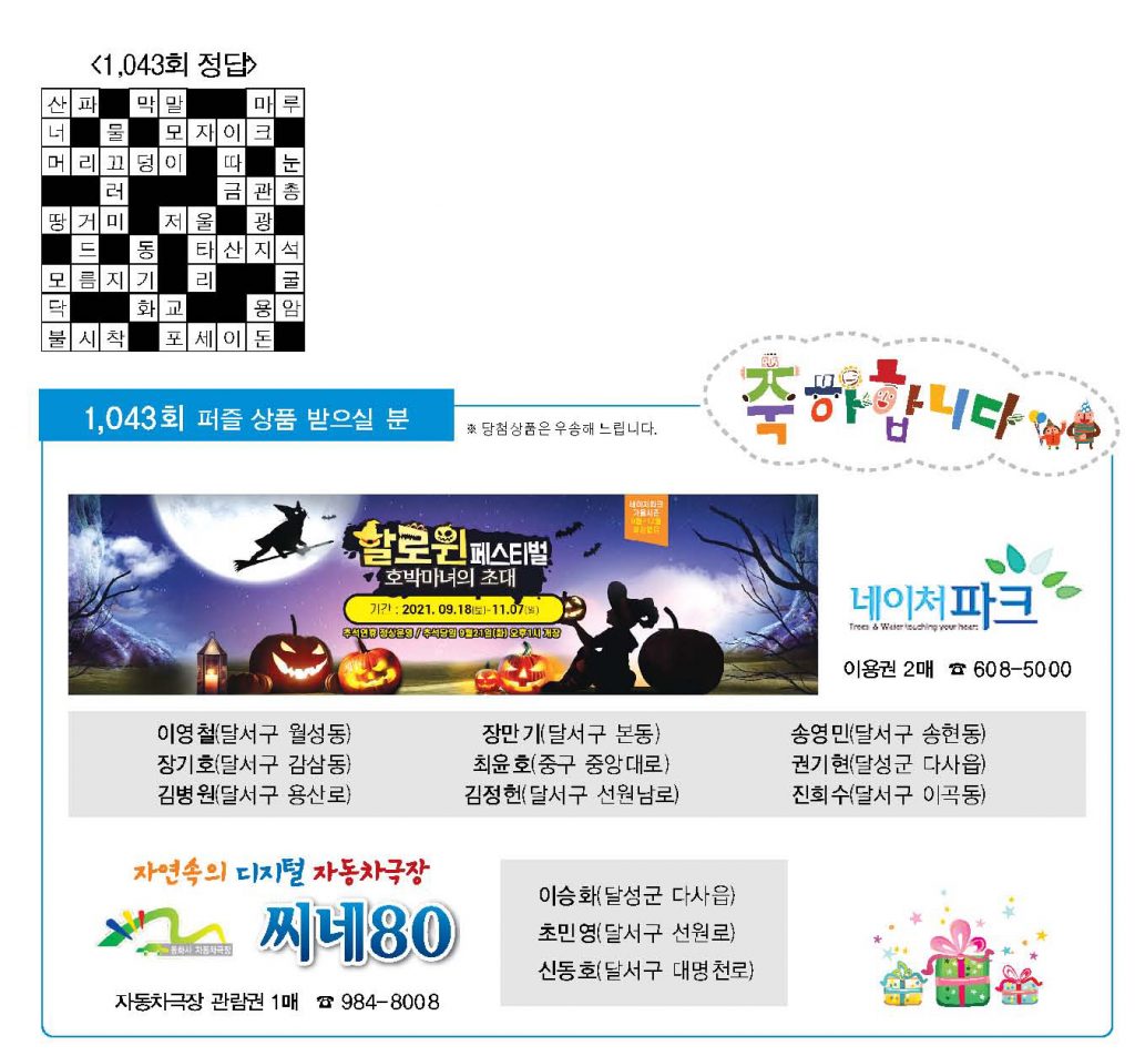 ♣ ‘가족과 함께 풀어보세요’정답을 아시는 분은 본사 편집부로 보내주시기 바랍니다. 11월 2일까지 도착된 엽서 중에서 추첨을 통해 상품을 드립니다. 주소를 정확히 기재해 주십시오. 당첨상품을 우송해 드립니다.