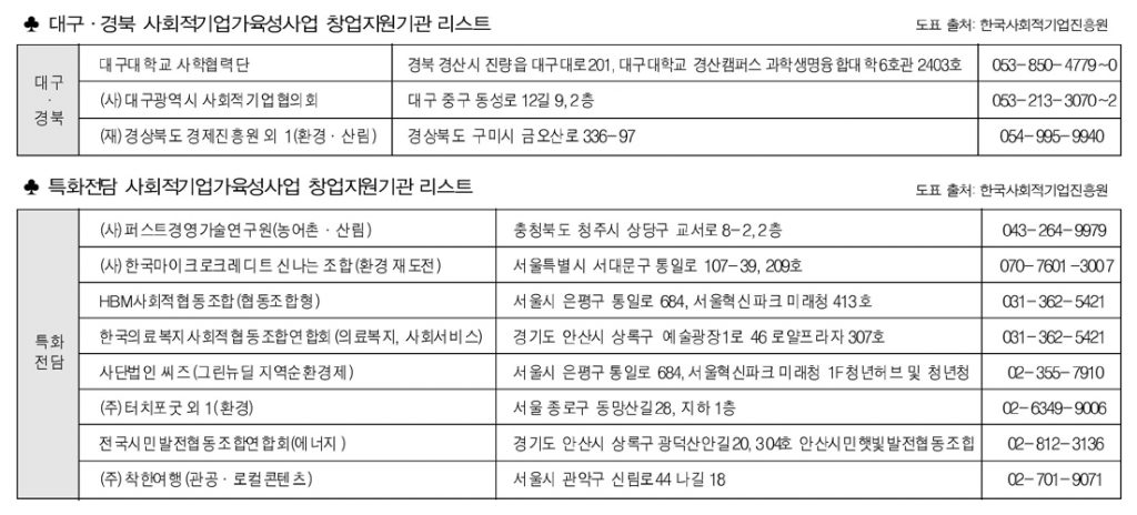 전국의 전문교육기관이 관련하여 사회적기업진흥원으로부터 창업지원 기관으로 선정되어 사회적 기업가 육성사업을 운영한다. 2021년 기준으로 대구경북지역에서는 3군데의 지원기관이 사회적 기업가 육성사업을 진행한다. 대구대학교 산학협력단, (사)대구광역시 사회적기업협의회, (재)경상북도경제진흥원에서 사회적 기업가 육성사업을 지원하고 있다. 테이블 표를 참고하여 상세 질문이 있다면 직접 문의를 권해드린다.