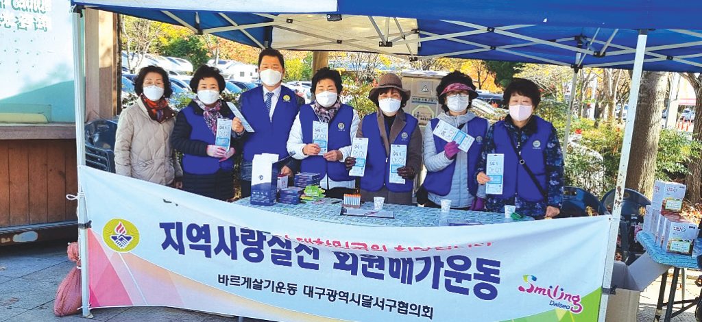 바르게살기운동달서구협의회(회장 이병호)는 지난 10일 (수) 오전 11시 여성회장 최태순 외 회원 17명과 용산동 향군회관 네거리에서 ‘가정사랑운동캠페인’을 개최해 현수막 게첨과 홍보물을 배부했다. 또, 12일(금) 오전 10시~오후 2시까지 여성회장 최태순 외 회원 10명은 두류공원 관광정보센터 앞에서 ‘2021년 회원배가 운동’을 펼쳤다.<자료제공:바르게살기운동달서구협의회>