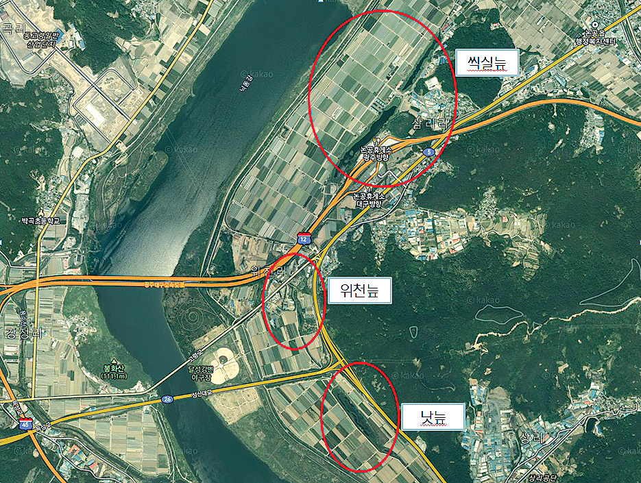 달성군 옥포읍과 논공읍은 각각 북쪽과 서쪽이 낙동강에 접해 있다. 이 지역을 통과하는 낙동강은 ‘C’자형으로 크게 굽어 흐르는데 그 규모가 낙동강 본류 전 구간에서도 가장 큰 편에 속한다. 그래서 이 곡류구간 안쪽으로 옥공들[마갯들], 위천들, 선망들 같은 넓은 범람원과 씩실늪·위천늪·낫늪 같은 배후습지가 잘 형성되어 있다.
