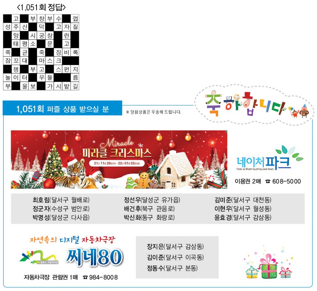 ♣ ‘가족과 함께 풀어보세요’정답을 아시는 분은 본사 편집부로 보내주시기 바랍니다. 12월 28일까지 도착된 엽서 중에서 추첨을 통해 상품을 드립니다. 주소를 정확히 기재해 주십시오. 당첨상품을 우송해 드립니다.