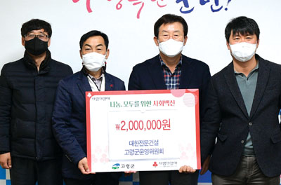 지난해 12월 31일(금) 대한전문건설고령군운영위원회(위원장 이대원)에서 이웃돕기 성금 200만 원, 고령군체육회(회장 이재근)에서 200만 원, 고령가구(대표 이동규) 100만 원, 이언환 님 50만 원을 기탁했다.