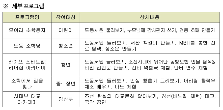 신설 프로그램인 청년 대상 ‘라이프 스타트업! 리더십 아카데미’는 역할극과 난타 체험을 통해 한훤당 김굉필 선생의 애제자였던 조광조의 생애를 재조명하고 개혁 정신을 몸소 체험해 볼 수 있다. 또, 임산부 대상 ‘사대부 태교 아카데미’는 조선 태교 교실, 침선 태교, 국악 연주 등을 통해 조선 시대 태교 문화를 체험하고 산모와 태아에게 쉼과 힐링의 시간을 선사하게 된다.