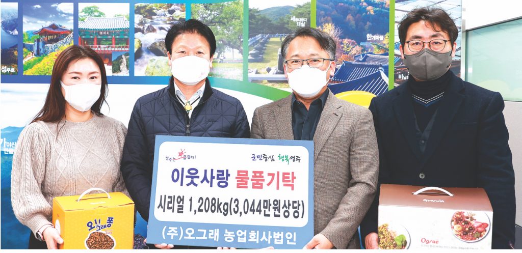 ㈜오그래 농업회사법인(대표 장종현)은 지난 24일 성주군청을 방문해 관내 저소득층 및 취약계층 아동을 위한 시리얼 1,208㎏(3,044만 원 상당)을 전달했다. 기탁된 시리얼은 곡물 귀리를 원재료로 사용해 만든 건강식품으로 지역아동센터 및 사회복지시설 9개소에 전달될 예정이다.