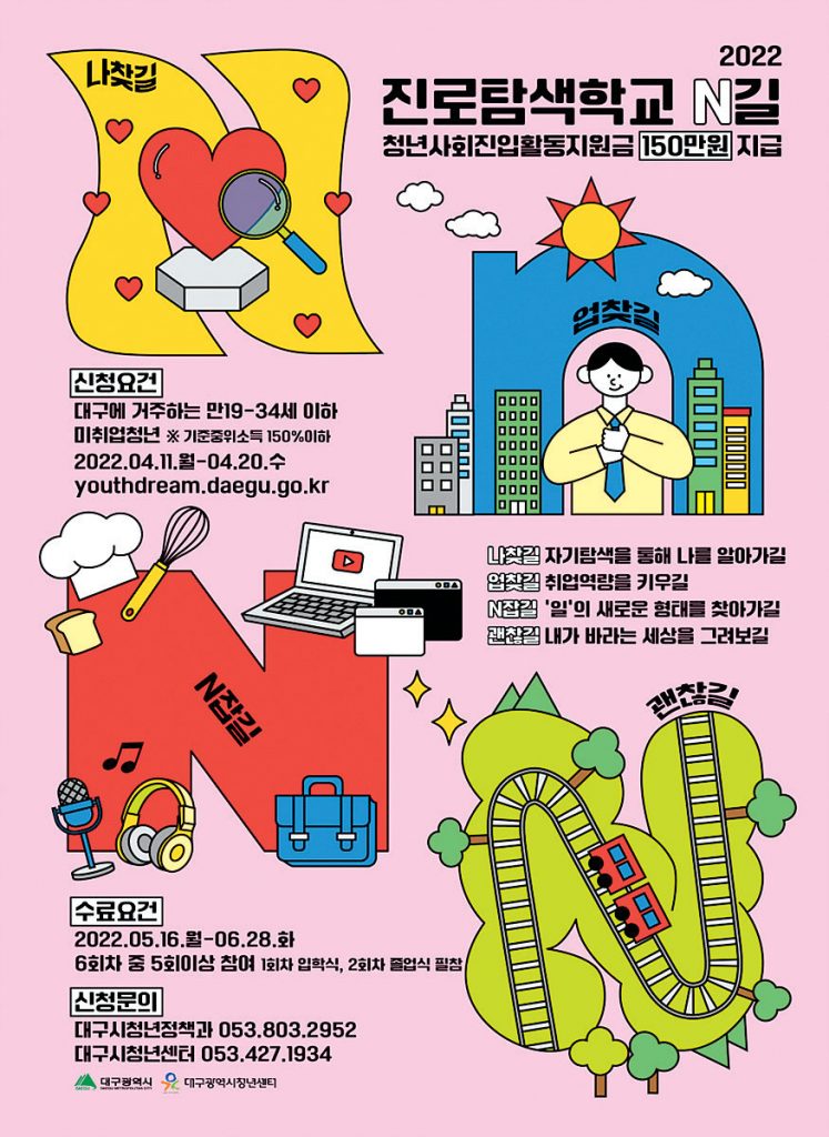 대구시와 대구시청년센터는 청년이 자신의 길을 선택하는 데 도움이 될 수 있도록 진로탐색의 기회를 제공하는 ‘진로탐색학교 N길 1’에 참여할 청년들을 4월 20일(수)까지 모집한다.