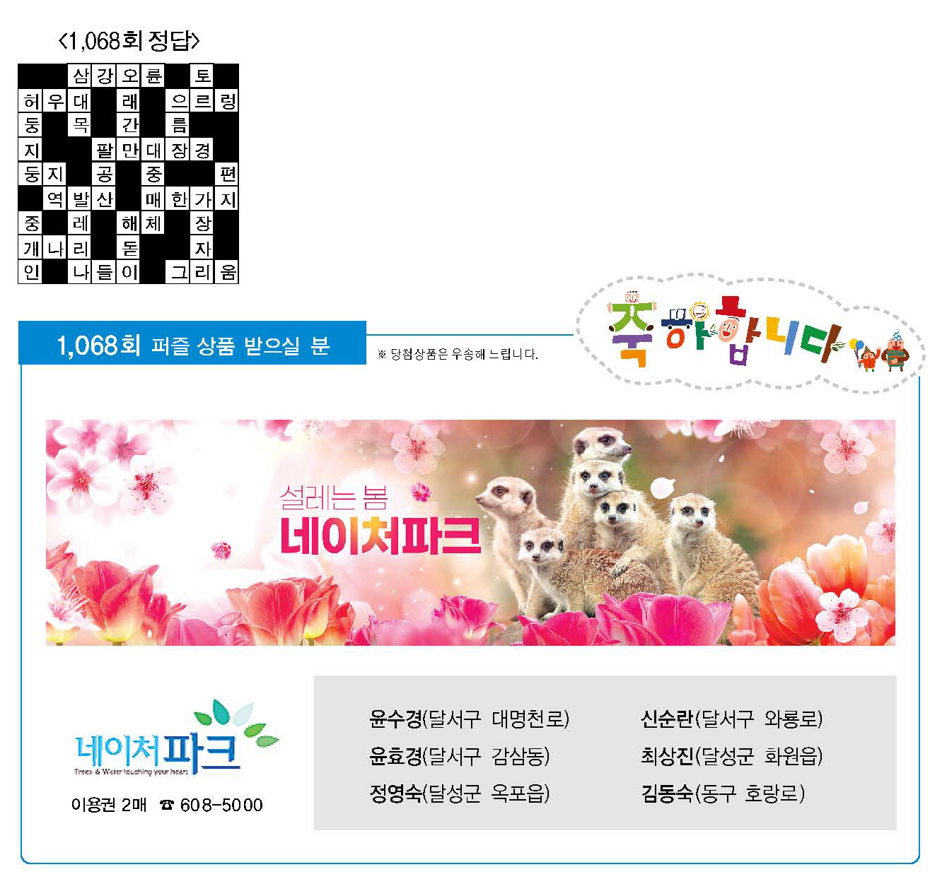 ♣ ‘가족과 함께 풀어보세요’정답을 아시는 분은 본사 편집부로 보내주시기 바랍니다. 5월 3일까지 도착된 엽서 중에서 추첨을 통해 상품을 드립니다. 주소를 정확히 기재해 주십시오. 당첨상품을 우송해 드립니다.
